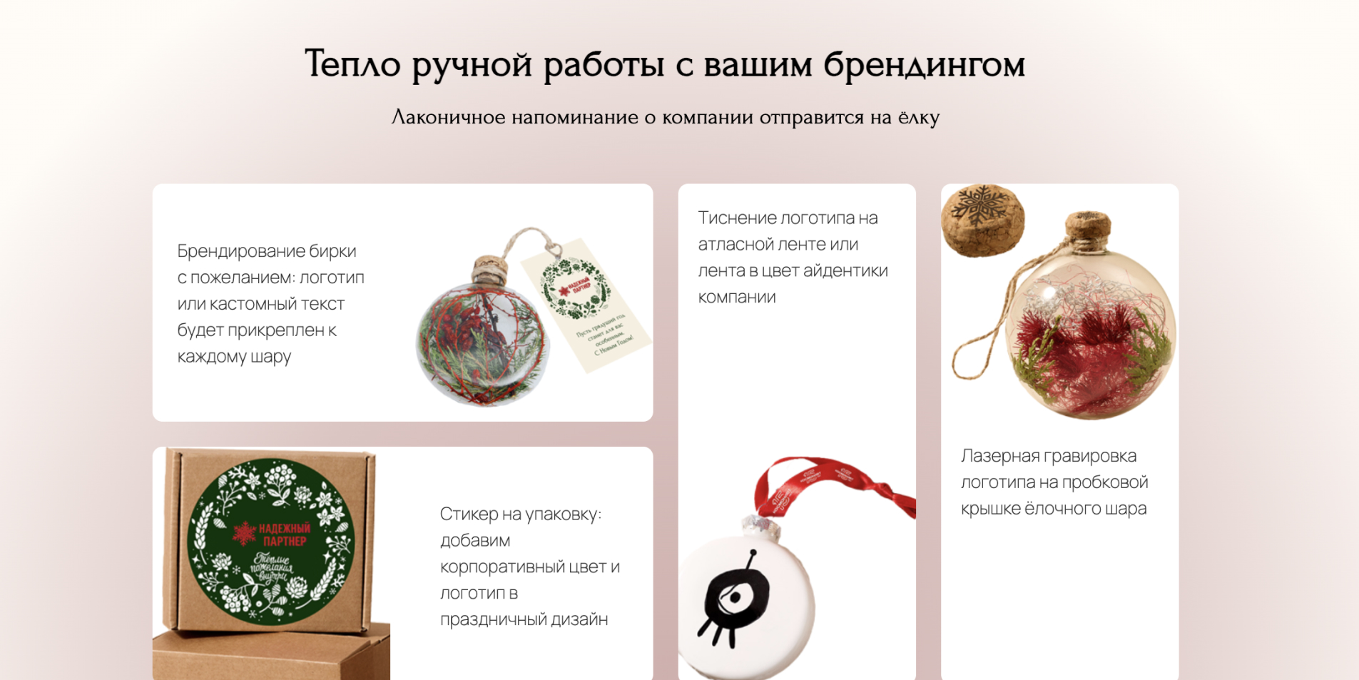Внутри каждого шара — натуральные растения, собранные и высушенные вручную. Это транслирует ценности экологичности, заботы и внимания к деталям. Такой подарок работает на ваш имидж гораздо дольше, чем обычная сувенирка.