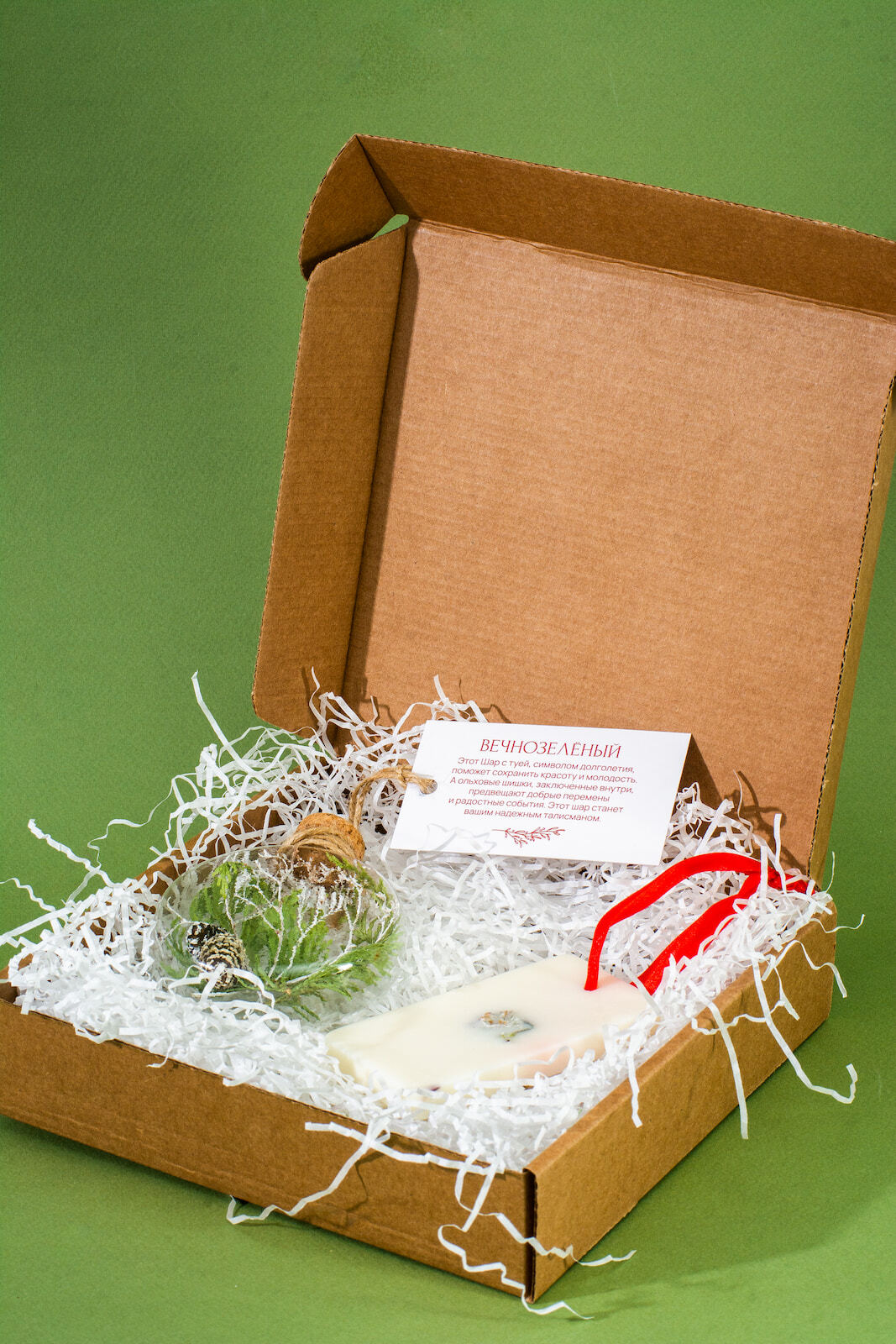 Набор из Шара-панно и Аромасаше в красивой подарочной коробке с праздничным стикером "Теплые Пожелания Внутри" и бумажным наполнителем. Вам останется только самое приятное - подарить!