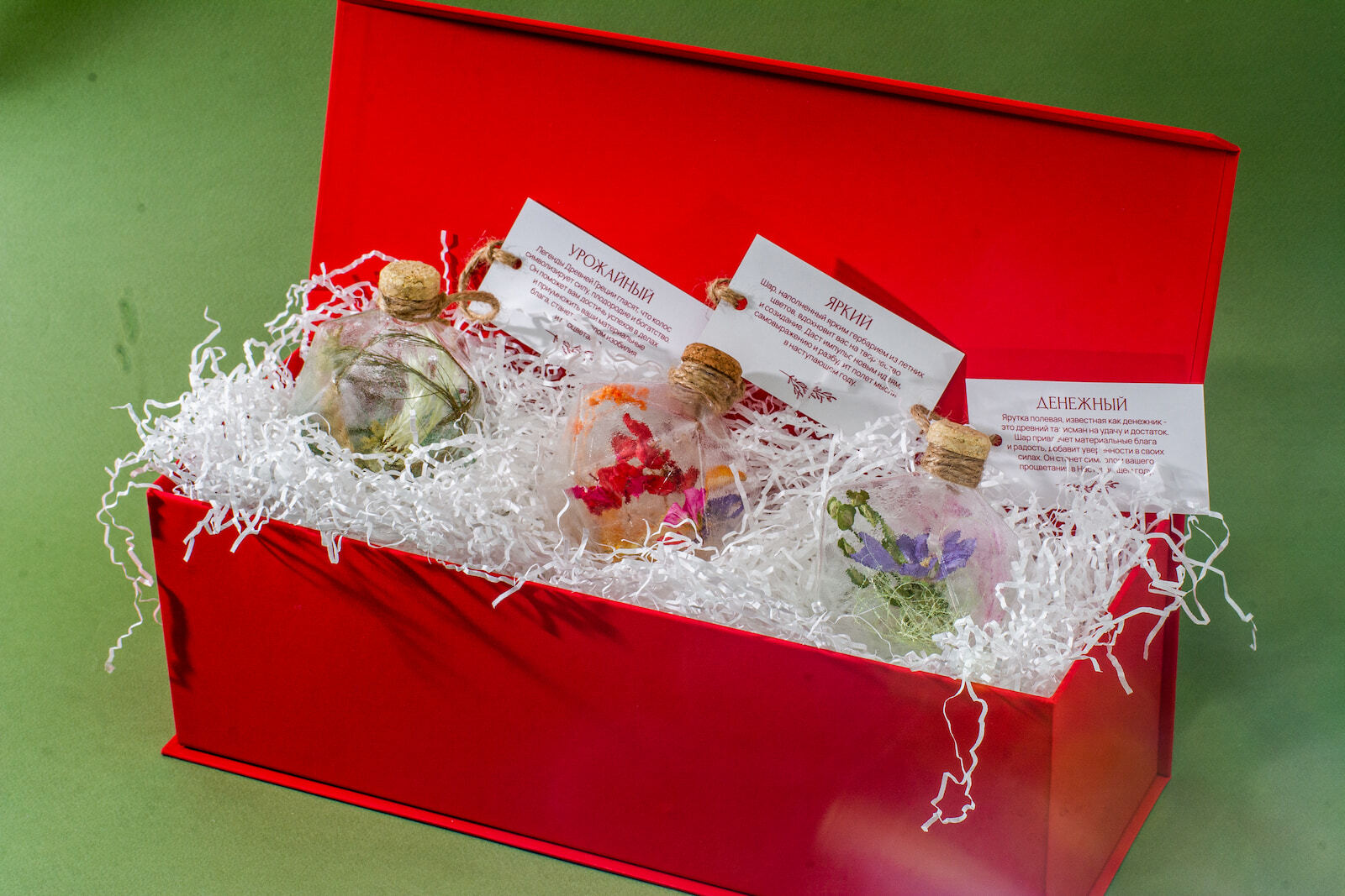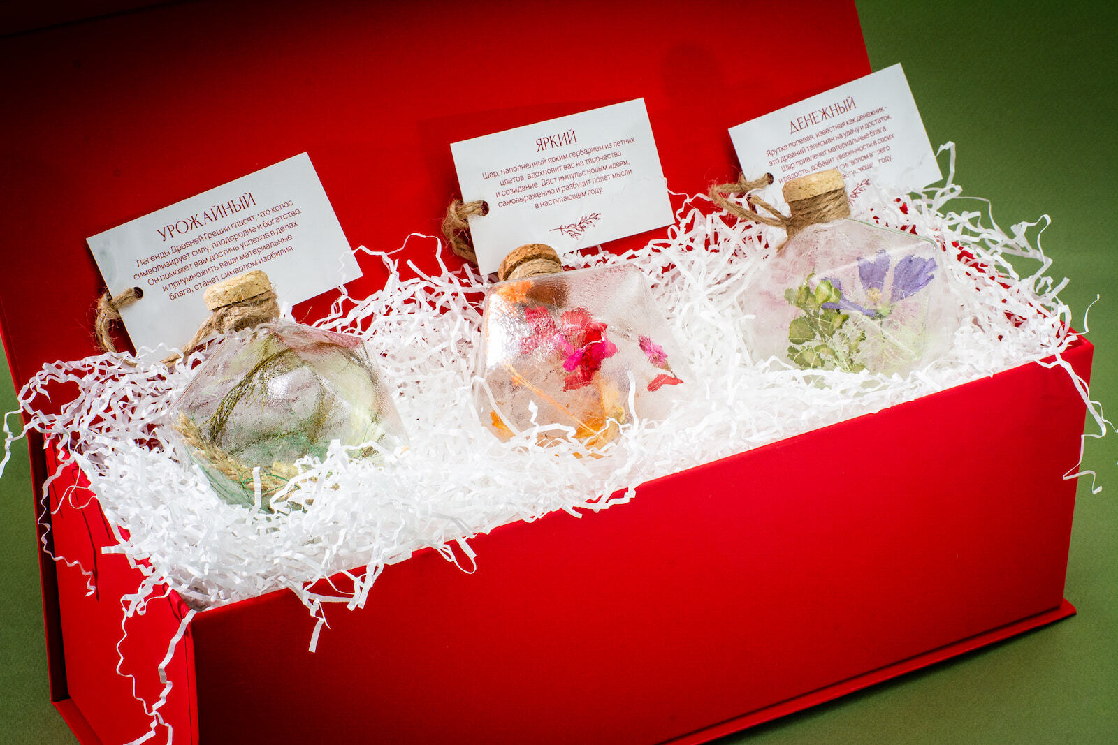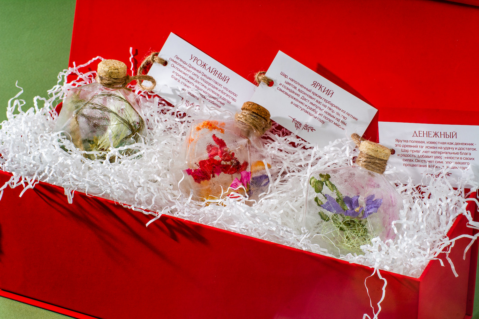 К шарам из этой коллекции прикреплены бирки с пожеланиями, соответствующими символизму цветов и растений внутри.