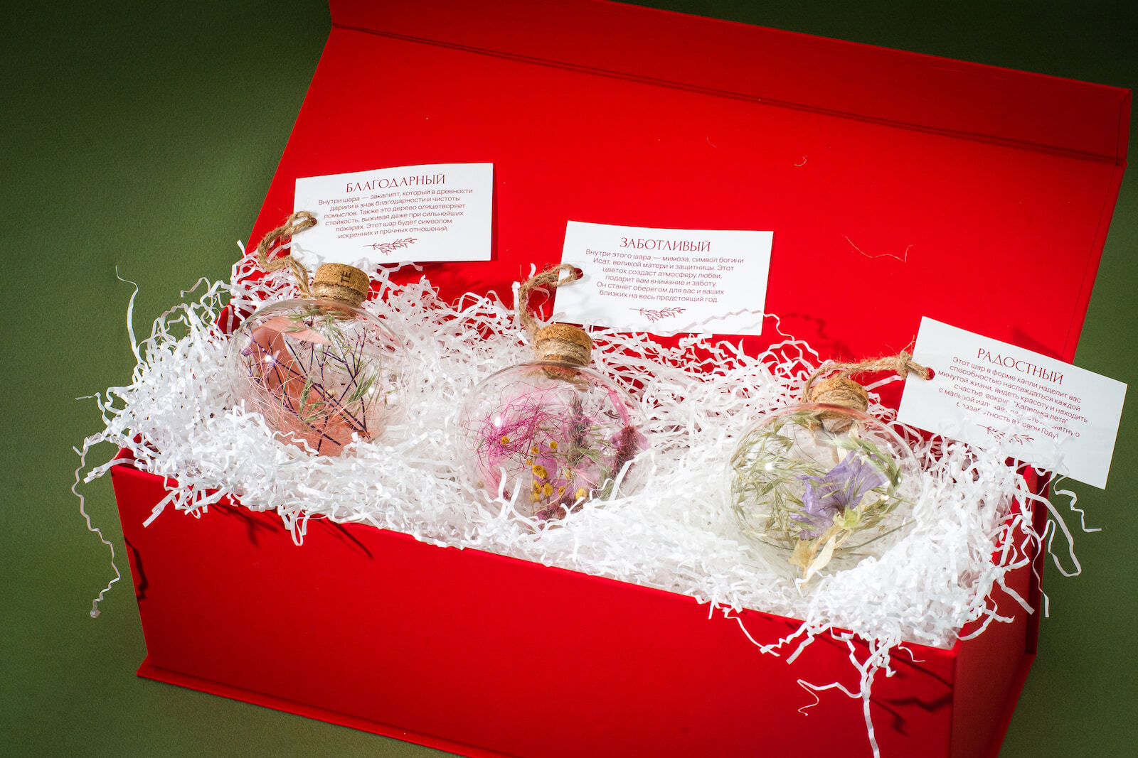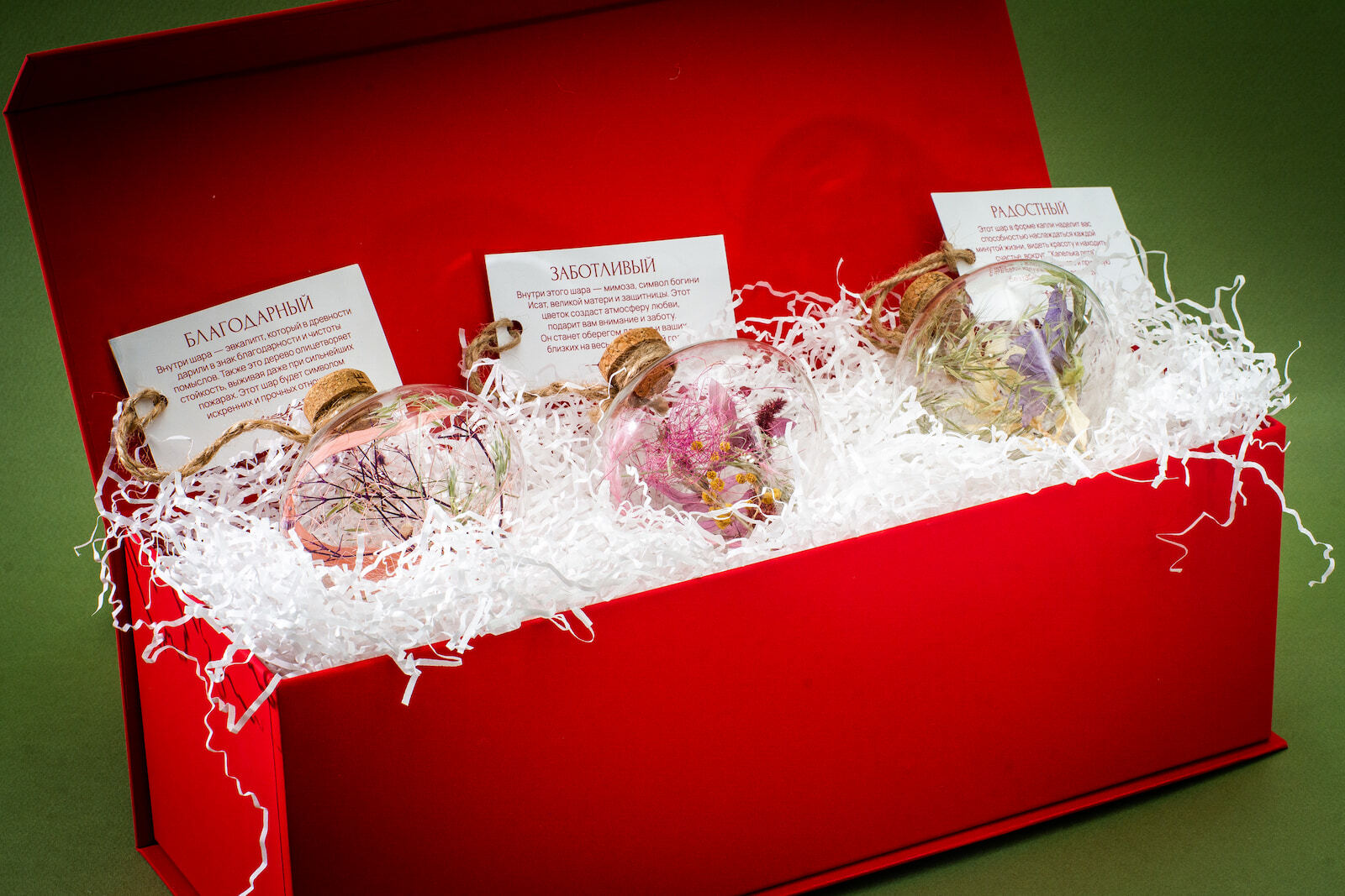 Набор из нескольких шаров-капель: Заботливый, Благодарный и Радостный в красивой подарочной коробке с праздничным стикером "Теплые Пожелания Внутри" и бумажным наполнителем. Вам останется только самое приятное - подарить!