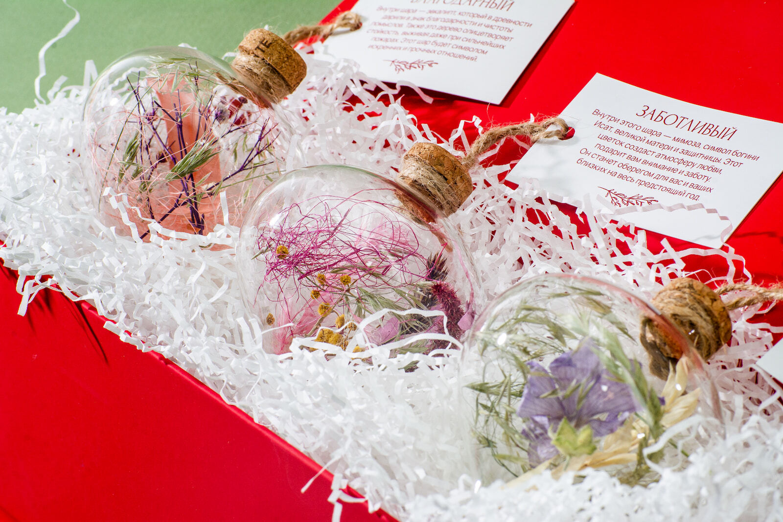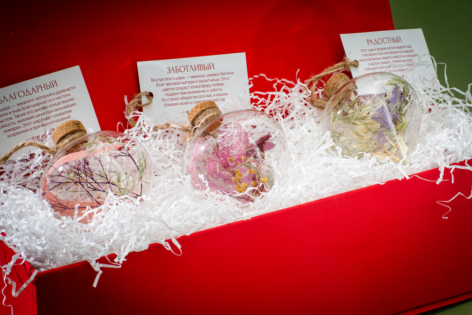 К шарам из этой коллекции прикреплены бирки с пожеланиями, соответствующими символизму цветов и растений внутри.