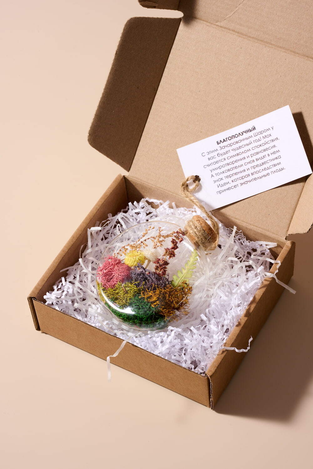 Елочный шар будет упакован в индивидуальную крафтовую коробку со стикером "Теплые пожелания внутри".