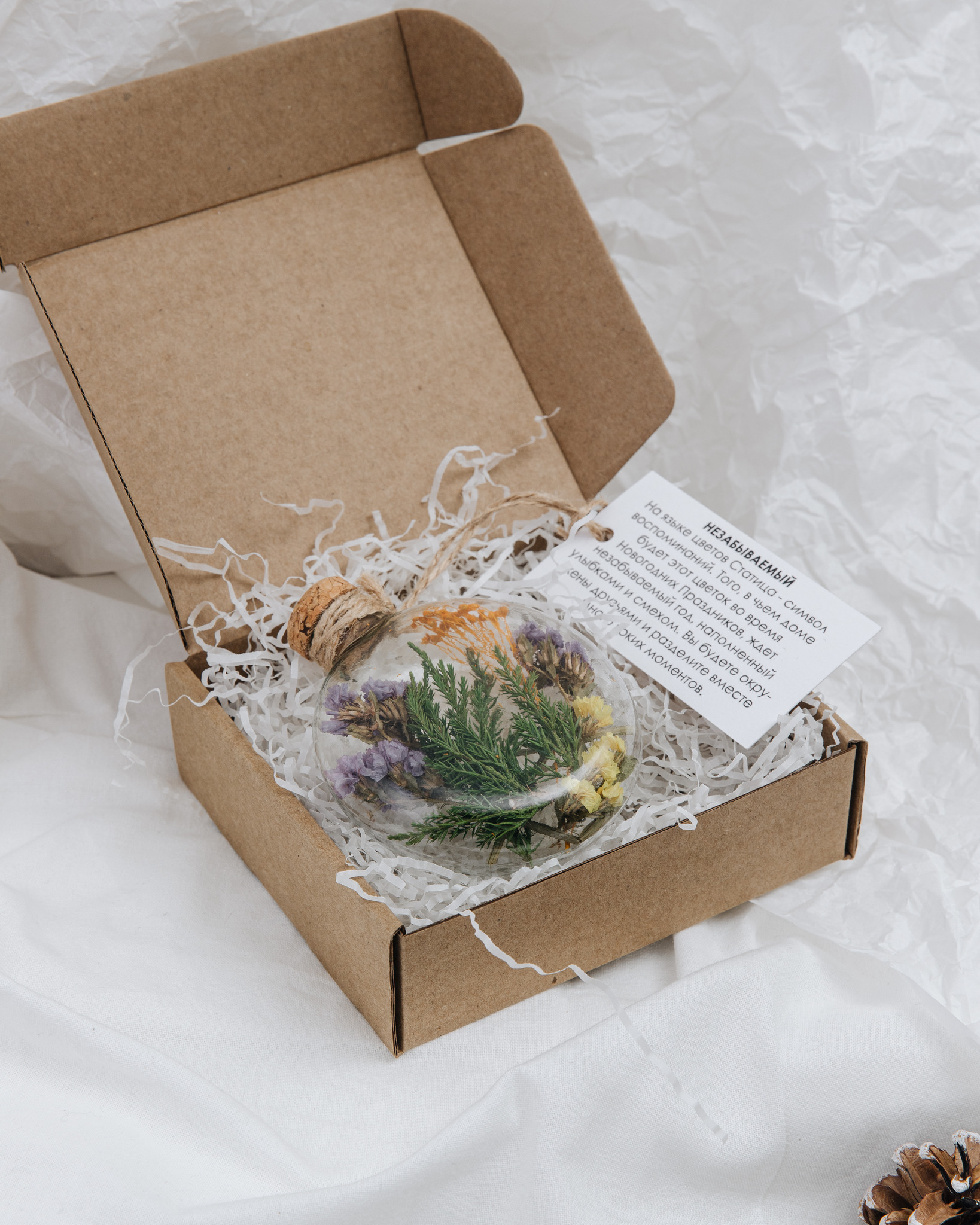 Елочный шар будет упакован в индивидуальную крафтовую коробку со стикером "Теплые пожелания внутри".