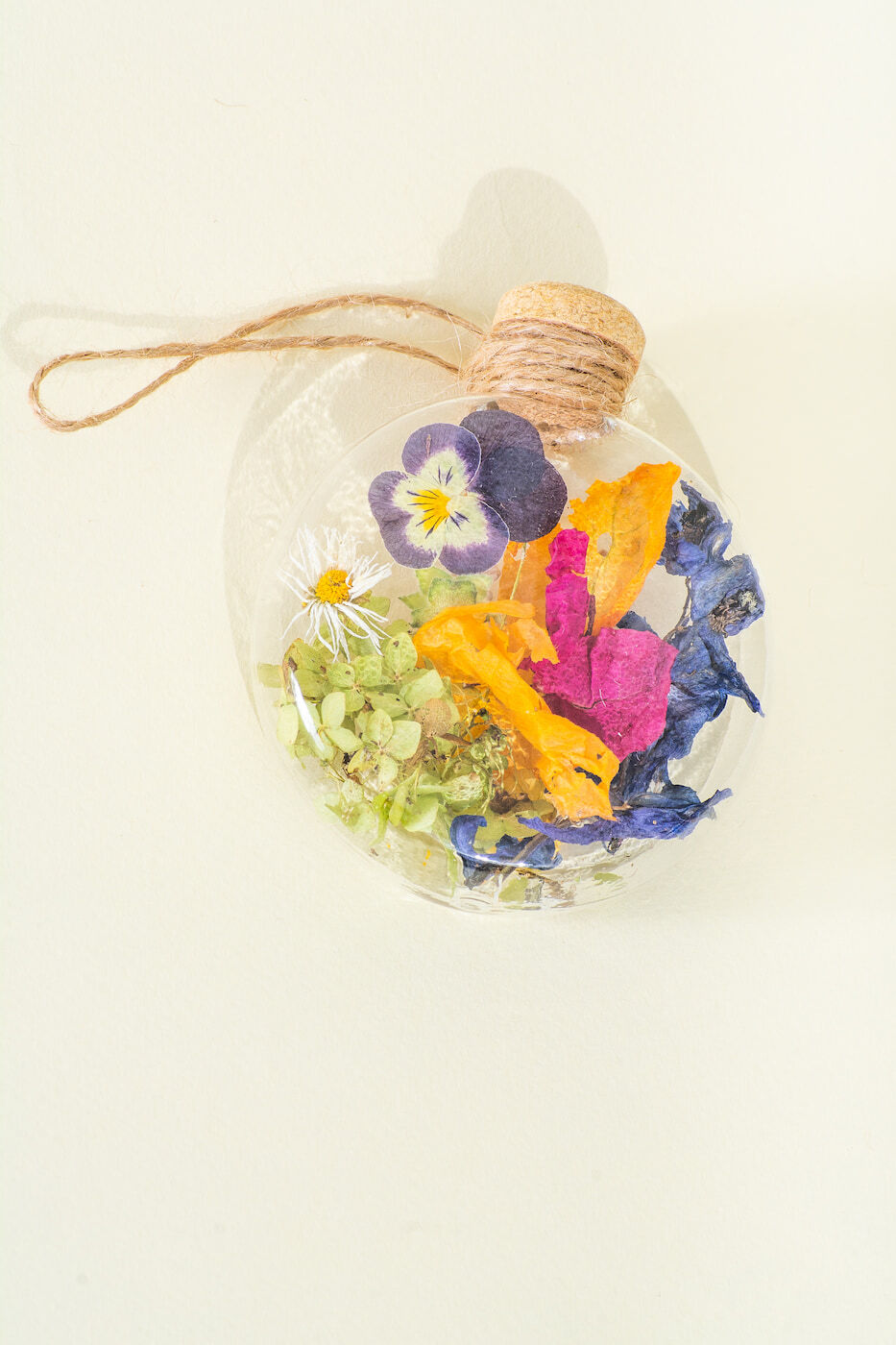 Шар, наполненный ярким гербарием из летних цветов, вдохновит вас на творчество и созидание, даст импульс новым идеям, самовыражению разбудит полёт мысли в наступающем году.