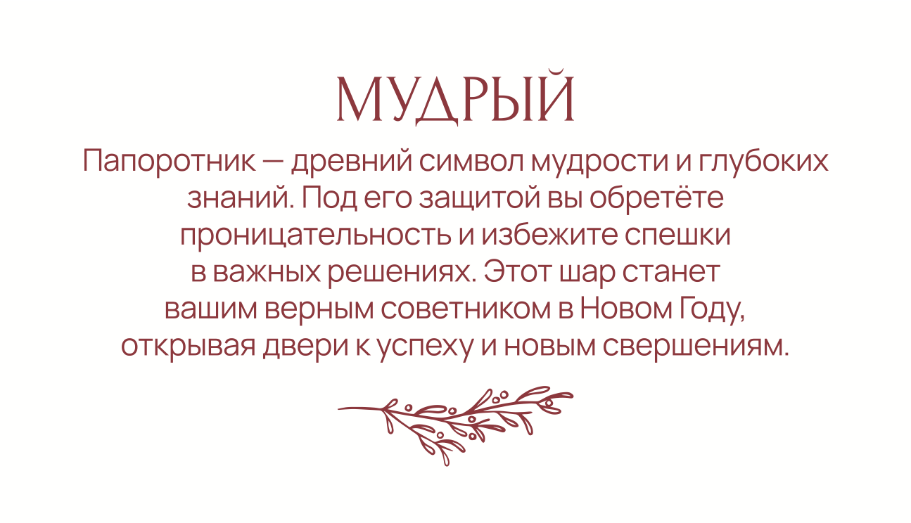 Папоротник — древний символ мудрости и глубоких знаний. Под его защитой вы обретёте проницательность и избежите спешки в важных решениях. Этот шар станет вашим верным советником в Новом Году, открывая двери к успеху и новым свершениям.