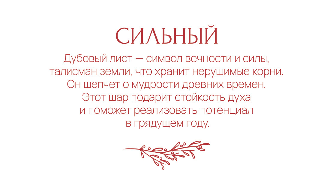 Дубовый лист - символ вечности и силы, талисман земли, что хранит нерушимые корни. Он шепчет о мудрости древних времен. Этот шар подарит стойкость духа и поможет реализовать потенциал в грядущем году.